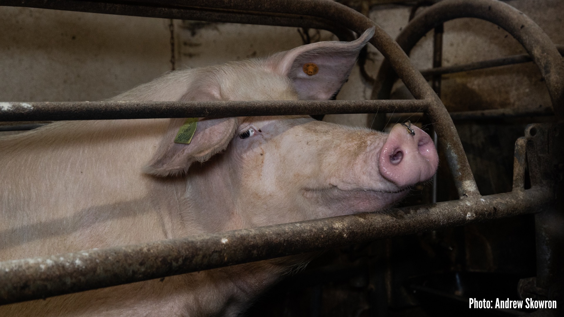 Although ten states across the U.S. have banned gestation crates, these abusive cages remain standard practice on the country’s largest pig factory farms. The stalls, typically seven feet long by two feet wide, are barely larger than the mother pig’s body, leaving her no room to turn around. Throughout the deeply emotional period of pregnancy, these vulnerable, highly intelligent animals can only stand up and lie down in place. The mother pigs often suffer injuries as a result of their confinement, including sores, lameness, urinary tract infections, and abrasions.