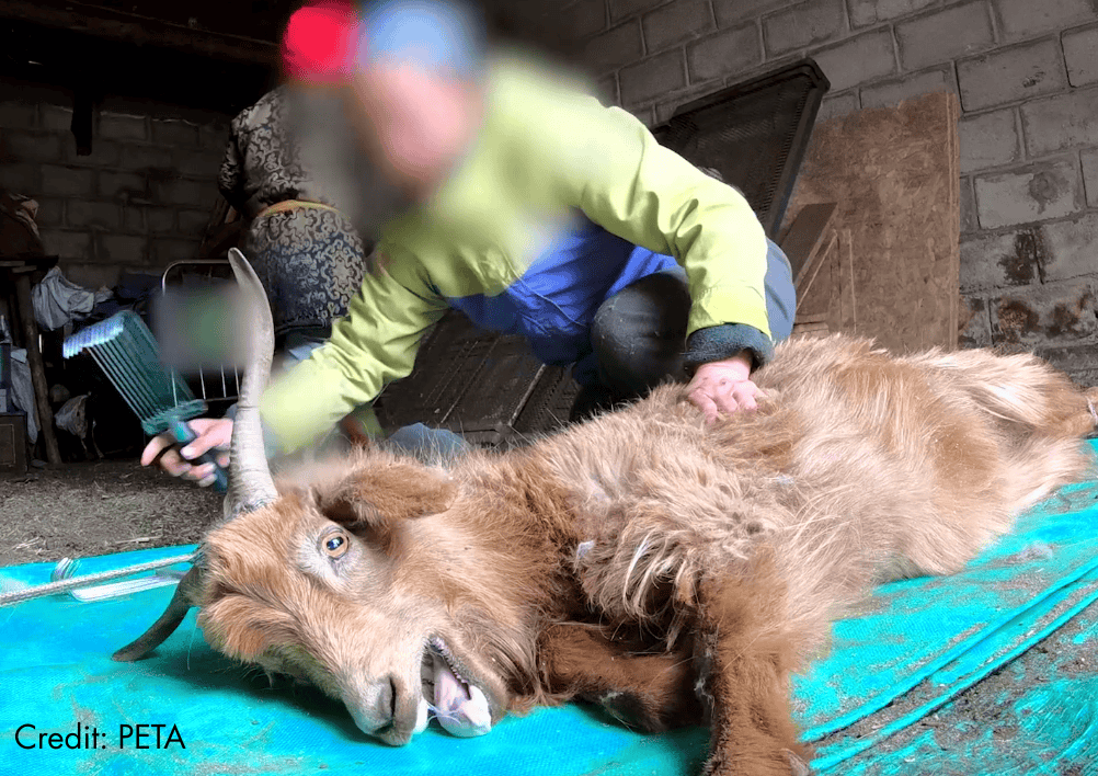 To collect their hair, goats are typically restrained and combed with sharp metal tools that rip the soft undercoat from their bodies. Undercover investigations of cashmere goat farms have documented goats left with bloody, untreated wounds after shearing, and others with pieces of skin torn away along with their hair. PETA Asia has reported that this process can take up to an hour per animal, during which goats have been documented struggling in agony while pinned down by their legs and horns. Once their coats are stripped away, these animals are left vulnerable to extreme cold, disease, and stress, having lost the natural insulation they evolved to survive harsh climates.